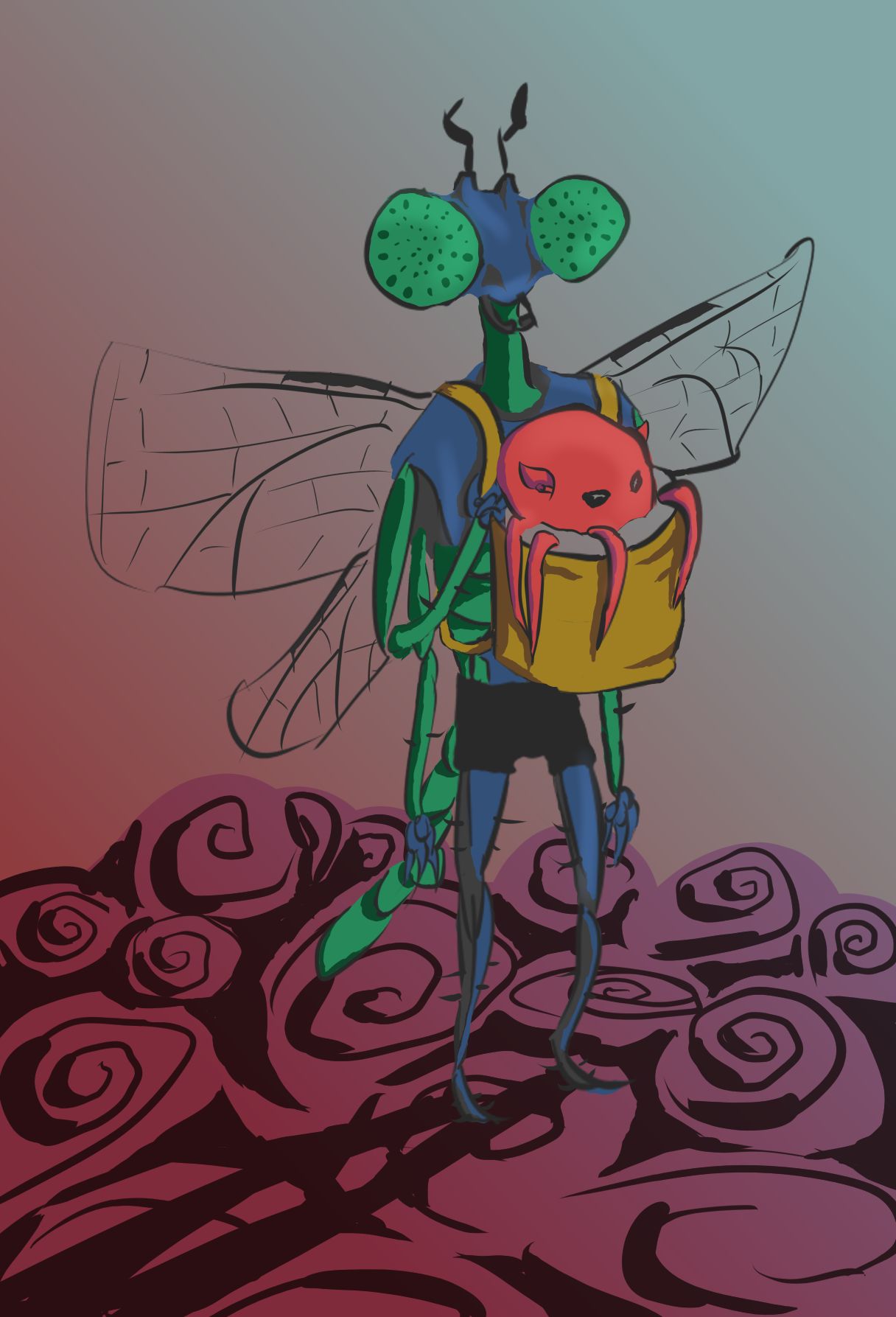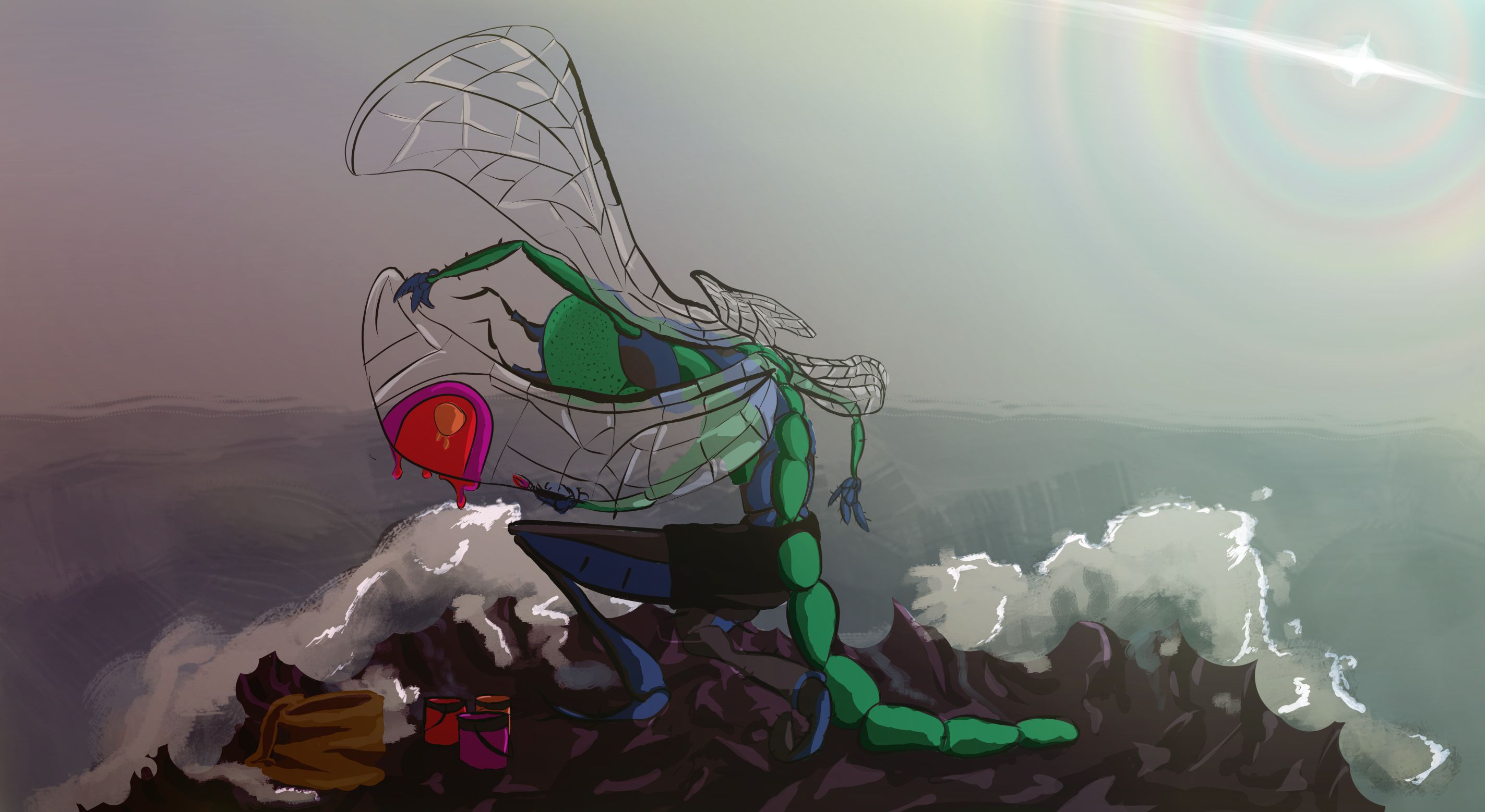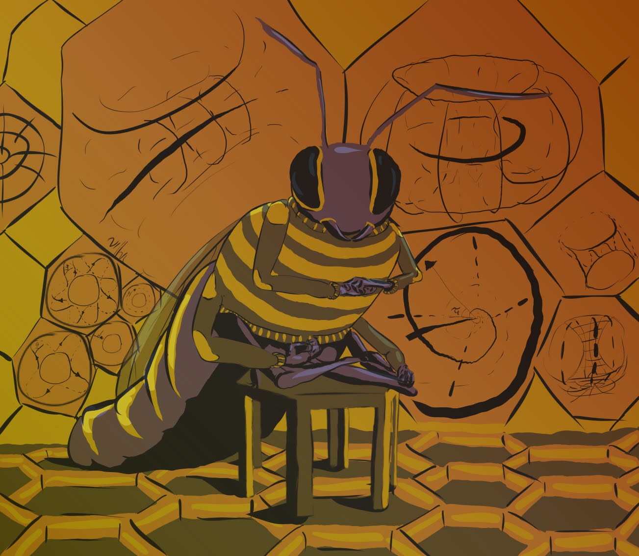 A darkest shadow hid the sky, lurching in front of the hive entrance and many bees abandoned insanity to heed an unheard command to suffocate within a yellow-orange sludge.