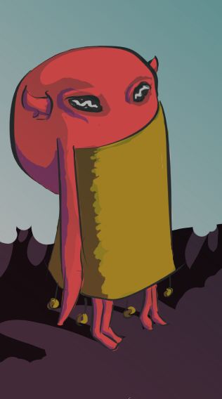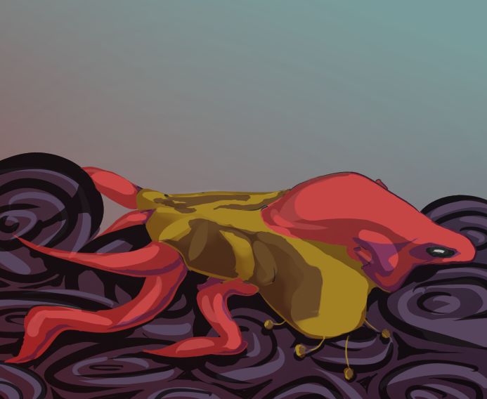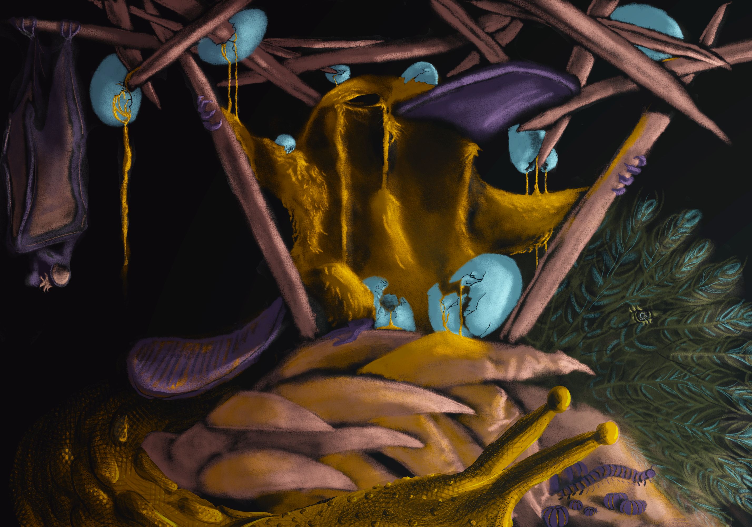 Mangled wings poked through molten jelly, like egg-yolk broken over multi-rowed, rotten shark-teeth.