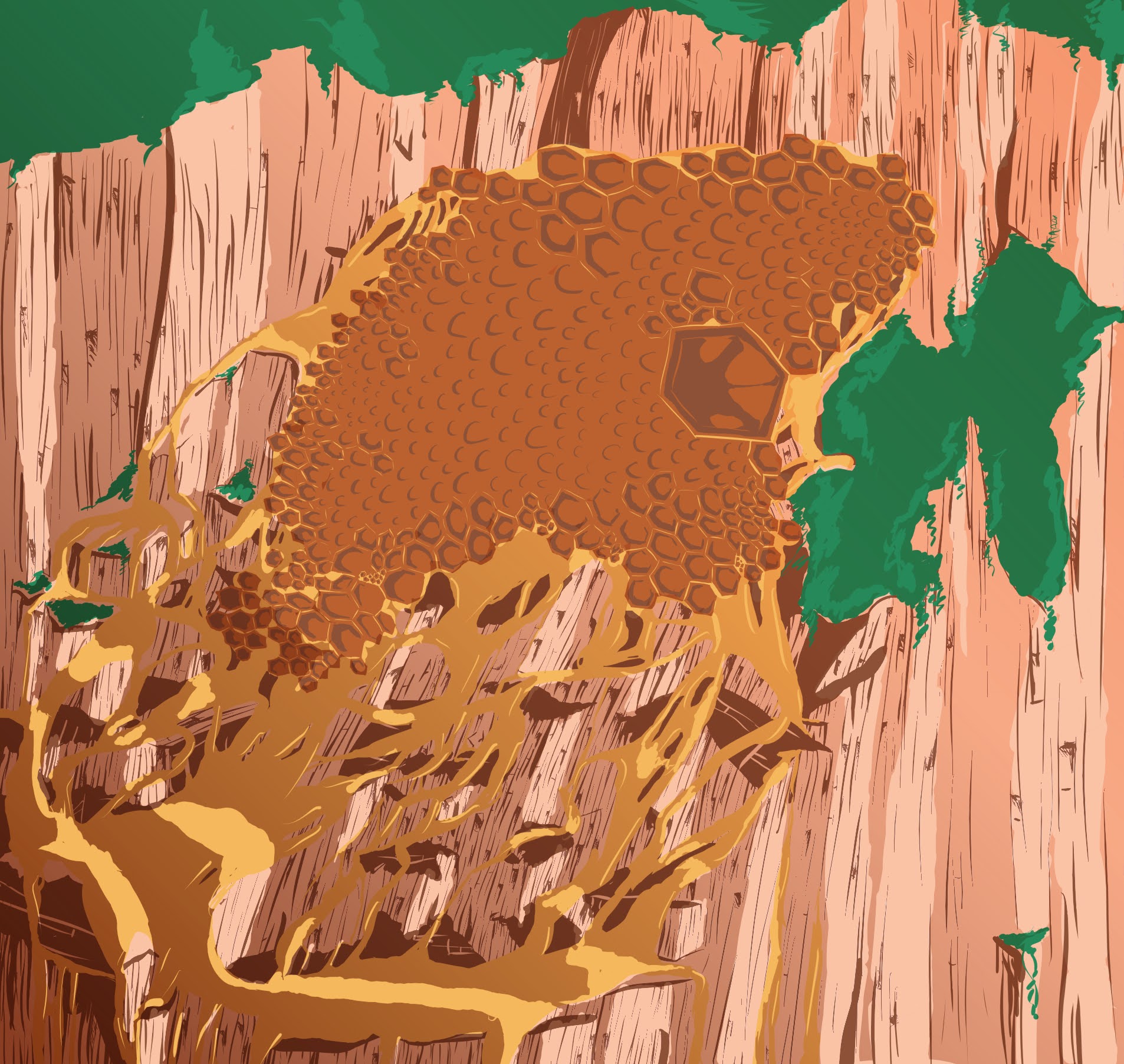 There were bees standing guard, bees playing on the patches of flora on the cliff, and many more bees crawling over the walls within the hive, arranging pockets of viscous orange liquid and tiles that seemed a hardened, or sometimes jelly-like, version of the same substance.
